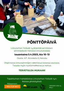 - Osallistumme Päijät-Hämeen lintutieteellisen yhdistyksen organisoimaan valkoselkätikan ja muiden metsälintujen talviruokintaan.